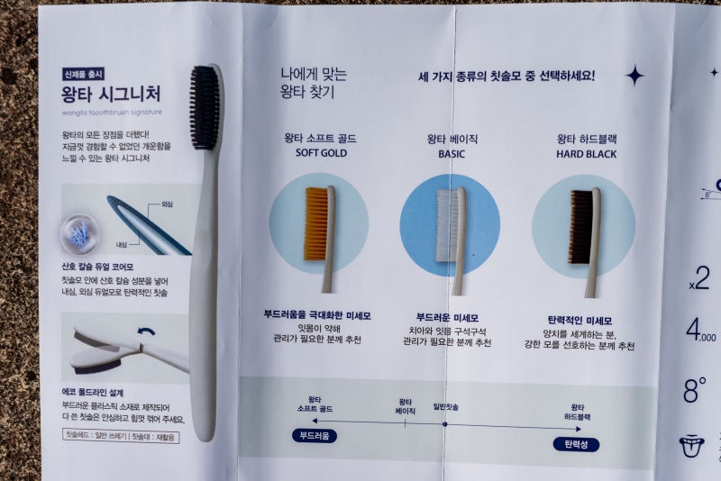 사용설명서가 함께 들어 있어서 읽기 편했고, 시그니처 제품은 산호칼슘 성분이 들어간 산호칼슘 듀얼코어 칫솔모로, 내부와 외부 코어 듀얼모가 탄력이 있습니다. 칫솔 머리는 일반 쓰레기로 버리고, 칫솔 받침대는 재활용이 가능합니다. 칫솔모는 3가지 종류 중에서 선택할 수 있습니다. 잇몸이 약해서 케어가 필요한 분들은 왕타 소프트 골드가 있습니다. 잇몸 구석구석 케어가 필요한 분들은 왕타 베이직이 있습니다. 양치질을 세게 하고 강한 모를 선호하는 분들은 왕타 하드 블랙이 있습니다.