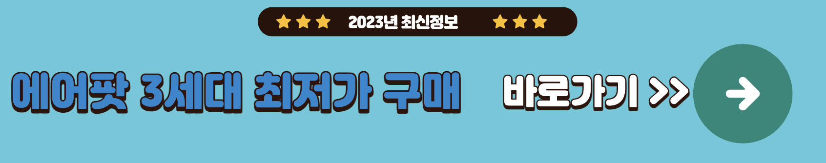2) 에어팟 3세대 출시연도 : 2021년 가격 : 189,000원 ​​충전방식 : 라이트닝 케이블 또는 무선충전패드로 충전 가능 배터리 사용시간 : 최대 6시간 사용, 충전케이스 사용 시 최대 30시간 무게 : 5.4g 연결 방식 : 블루투스 5.0 프로 : 세대가 높아질수록 충전 방식도 무선으로 충전이 가능하고 배터리 수명도 이전 모델에 비해 개선됐다. 또한 통화 품질을 향상시키기 위해 전파 감쇠 기능이 적용되었습니다. 단점: 이전 모델에 비해 약간 높은 가격.