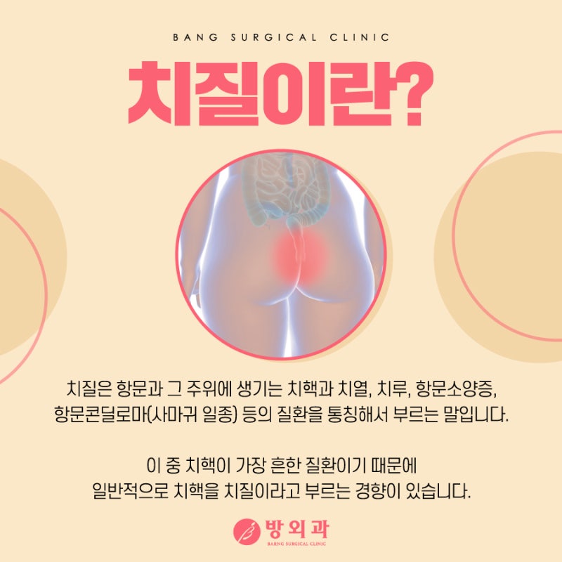 치질은 이러한 모든 증상, 즉 모든 항문 질환을 말합니다. 초기에는 일상생활에 큰 불편함이 없으나 방치하게 되면 심각한 증상을 동반하게 됩니다. 증상을 호전시키는 방법은 병원에 가서 치료를 받는 것입니다. 다양한 관리와 시술. 그리고 심한 경우에는 수술로 개선하는 방법도 있습니다.